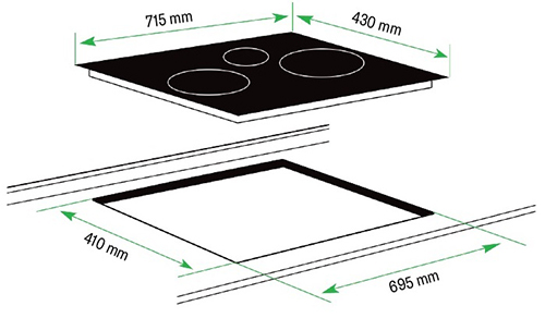 Bếp có kích thước bề mặt 715 x 430mm, kích thước khoét đá 695 x 410mm phù hợp với phần lớn không gian bếp. Phần thân và đáy bếp được làm bằng thép không gỉ cùng với hệ thống dây dẫn, quạt tản nhiệt và khe tản nhiệt giúp bếp luôn hoạt động ổn định và không bị nóng trong quá trình nấu nướng.